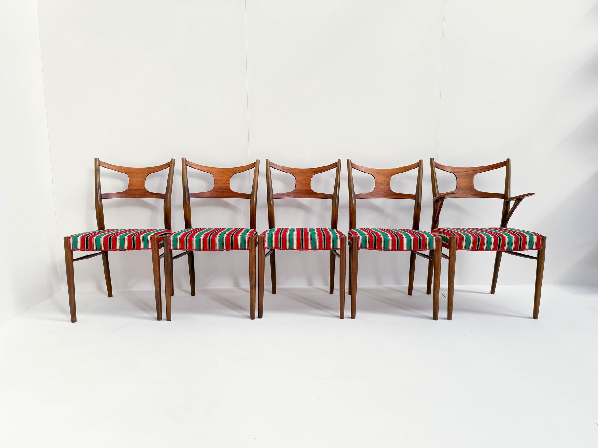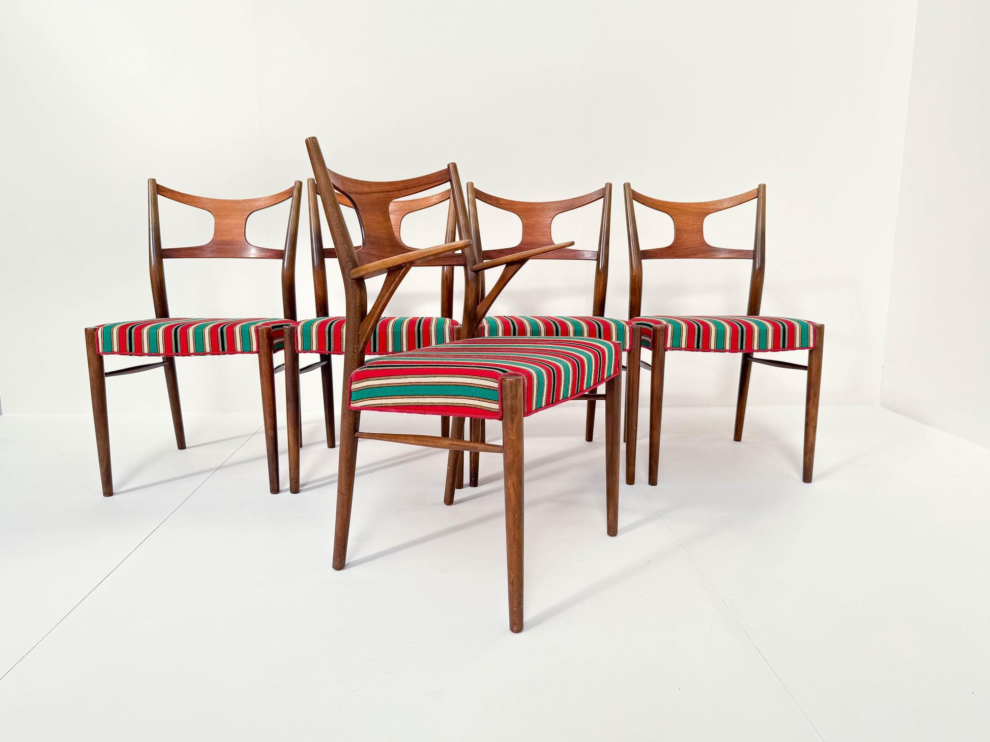 Rare set of 5 dining chairs by Kurt Østervig. Designed in the 1950s and produced by Randers Furniture, Denmark. The set includes four side chairs and one armchair, crafted in solid teak and oak. Sculpted backrests and original wool upholstery with vibrant striped fabric highlight the elegance of Danish mid-century modern design.