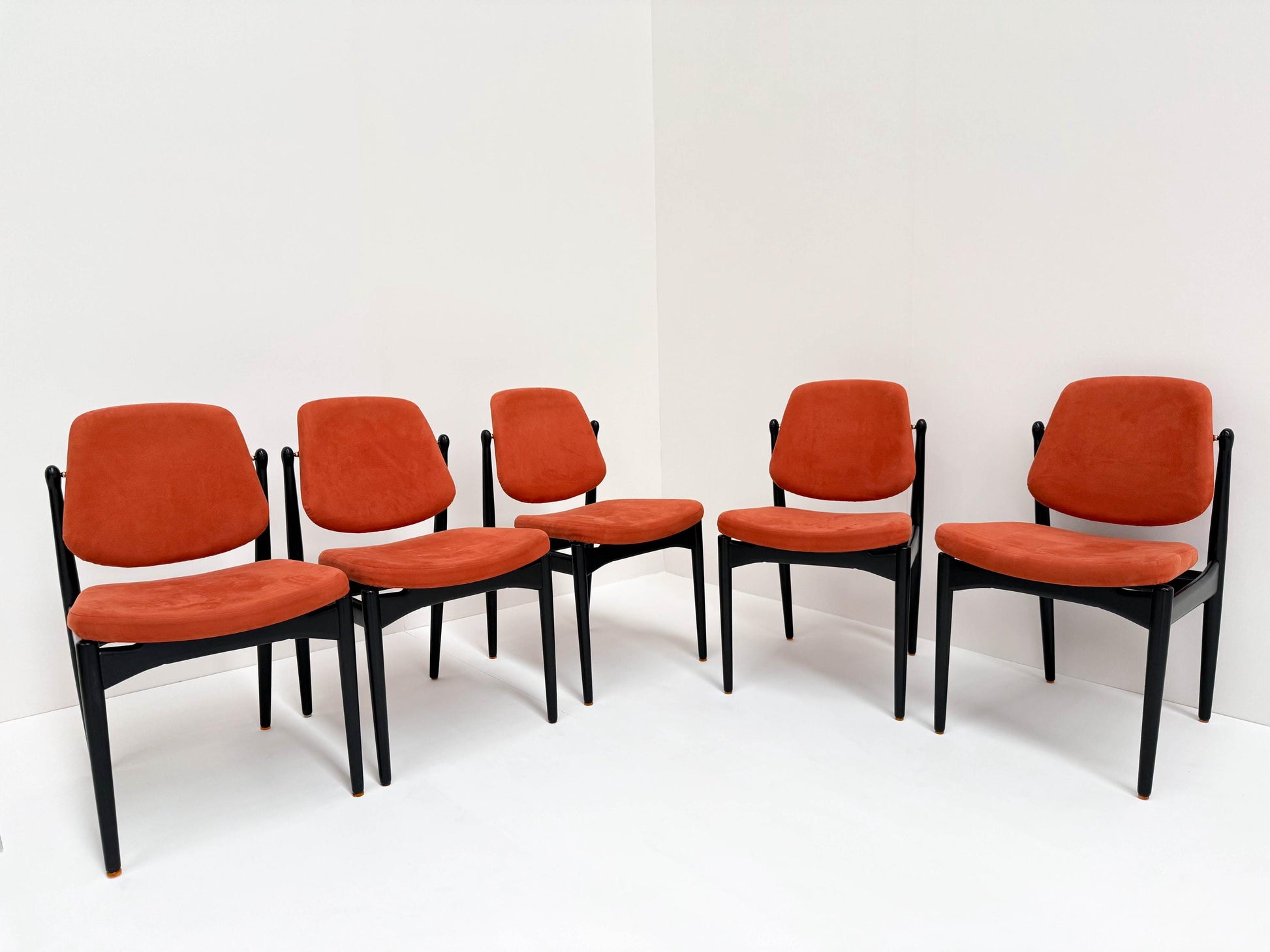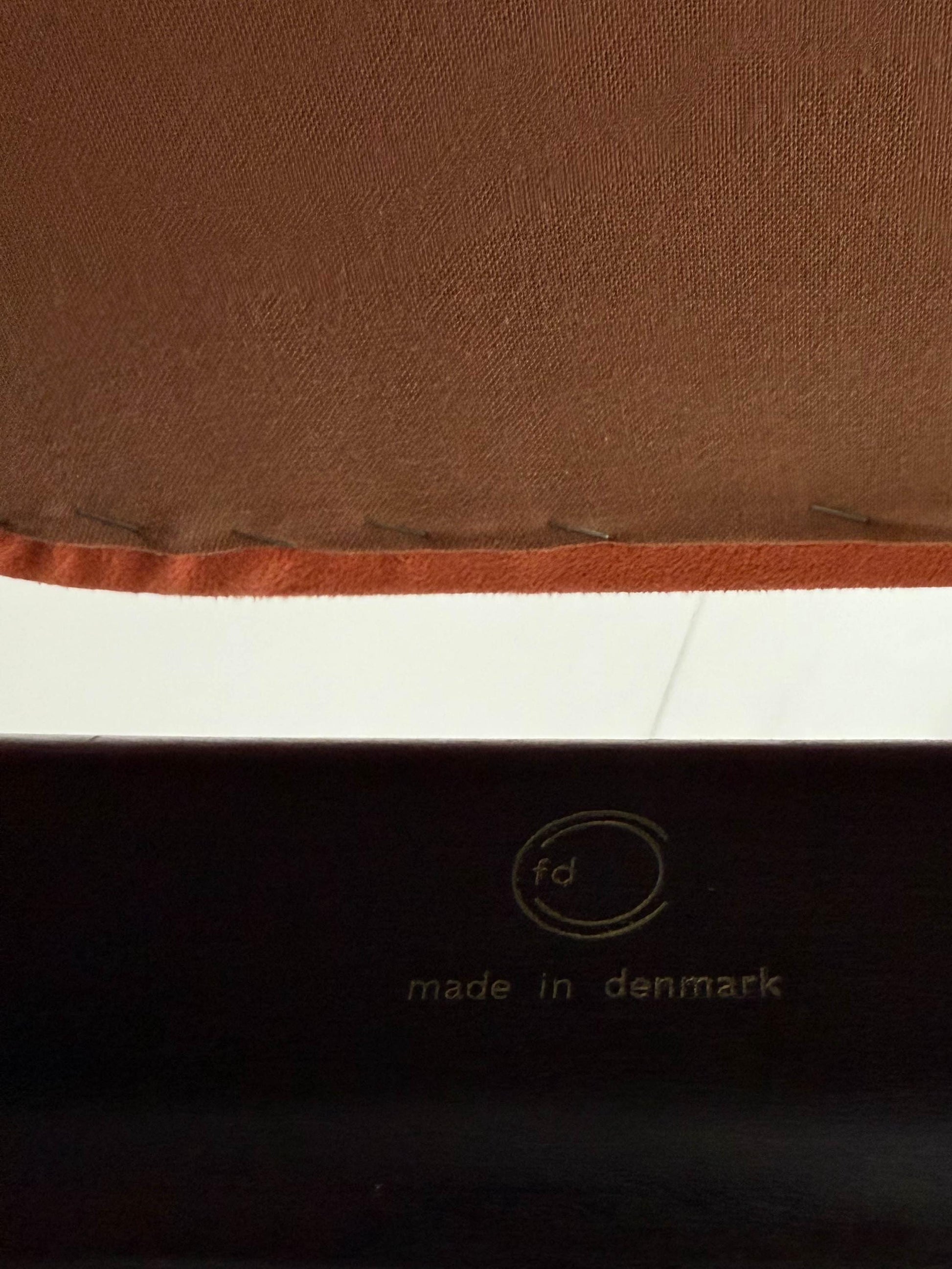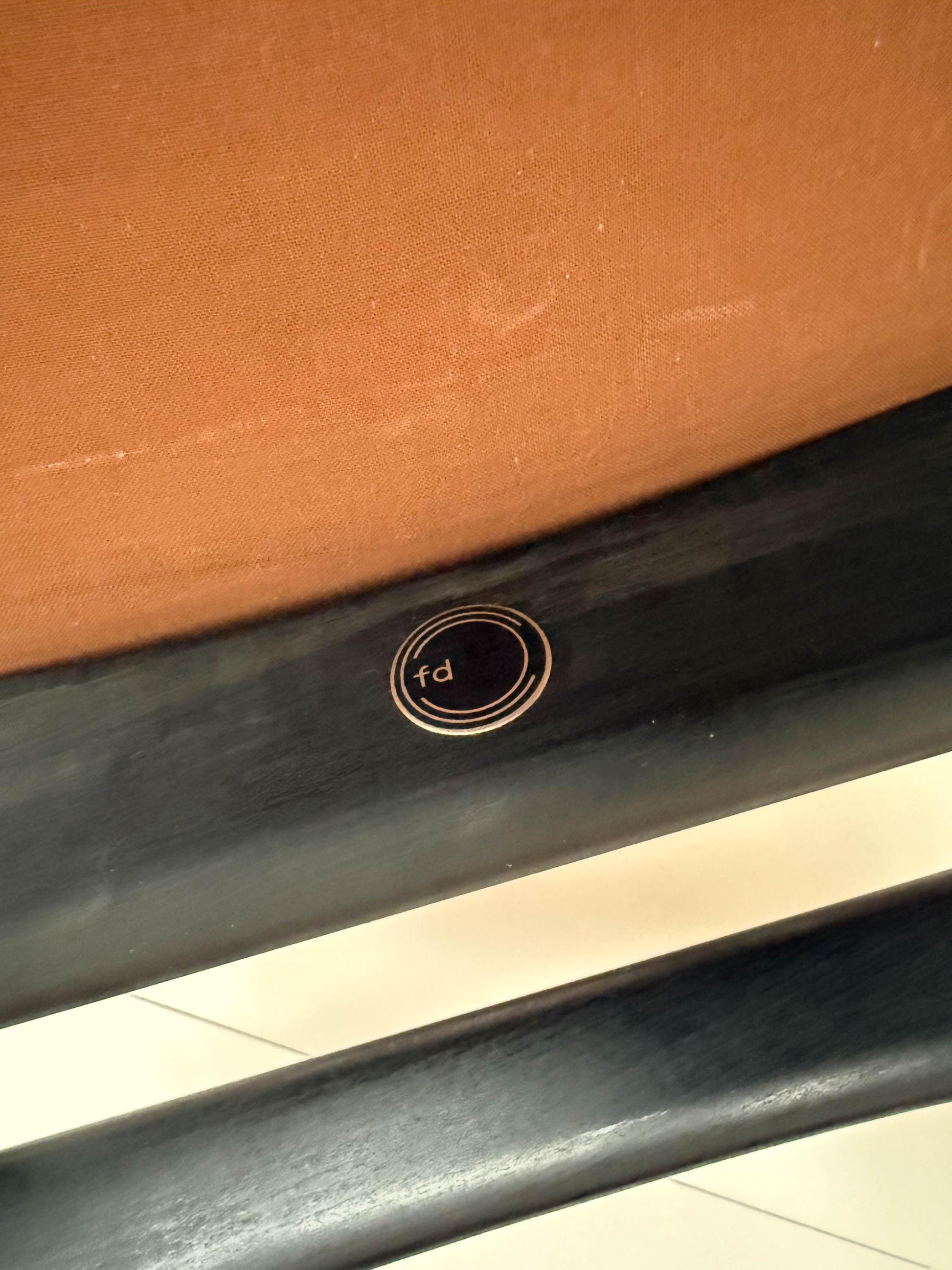 An exquisite set of five mid-century modern dining chairs designed by renowned Danish architect Arne Vodder and produced by France & Son. The sleek black wooden frames contrast beautifully with the burnt-orange upholstery, showcasing Vodder’s signature attention to detail and ergonomic form. Gently curved backrests and contoured seats deliver both visual refinement and lasting comfort. With their refined silhouette and quality materials, these vintage chairs make a striking statement for Scandinavian design lovers, collectors, and stylish interiors.