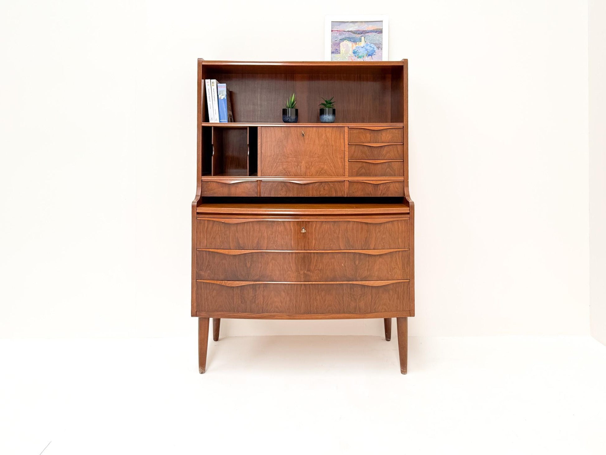 This elegant secretary desk was designed by Erling Torvits in Denmark in the 1960s. Crafted in beautiful natural walnut veneer, it features Torvits’ signature sculpted “wave” drawer fronts and a compact, highly functional layout. The top section includes small drawers, a lockable compartment, and an open shelf. The writing surface is not hinged but smoothly pulls out to provide a practical workspace. Below are three wide drawers for additional storage. The curved side panels and tapered legs reflect refined mid-century craftsmanship.