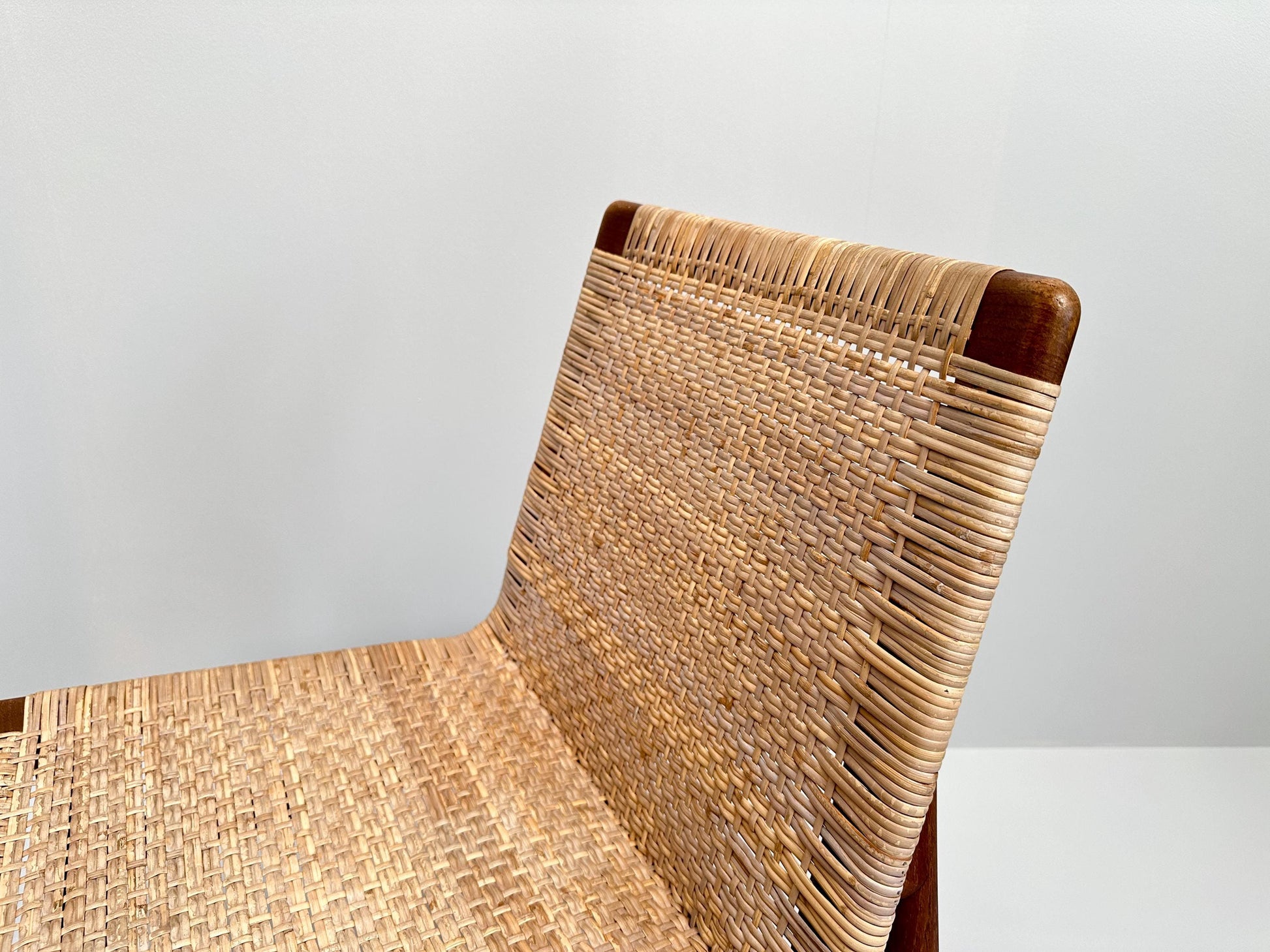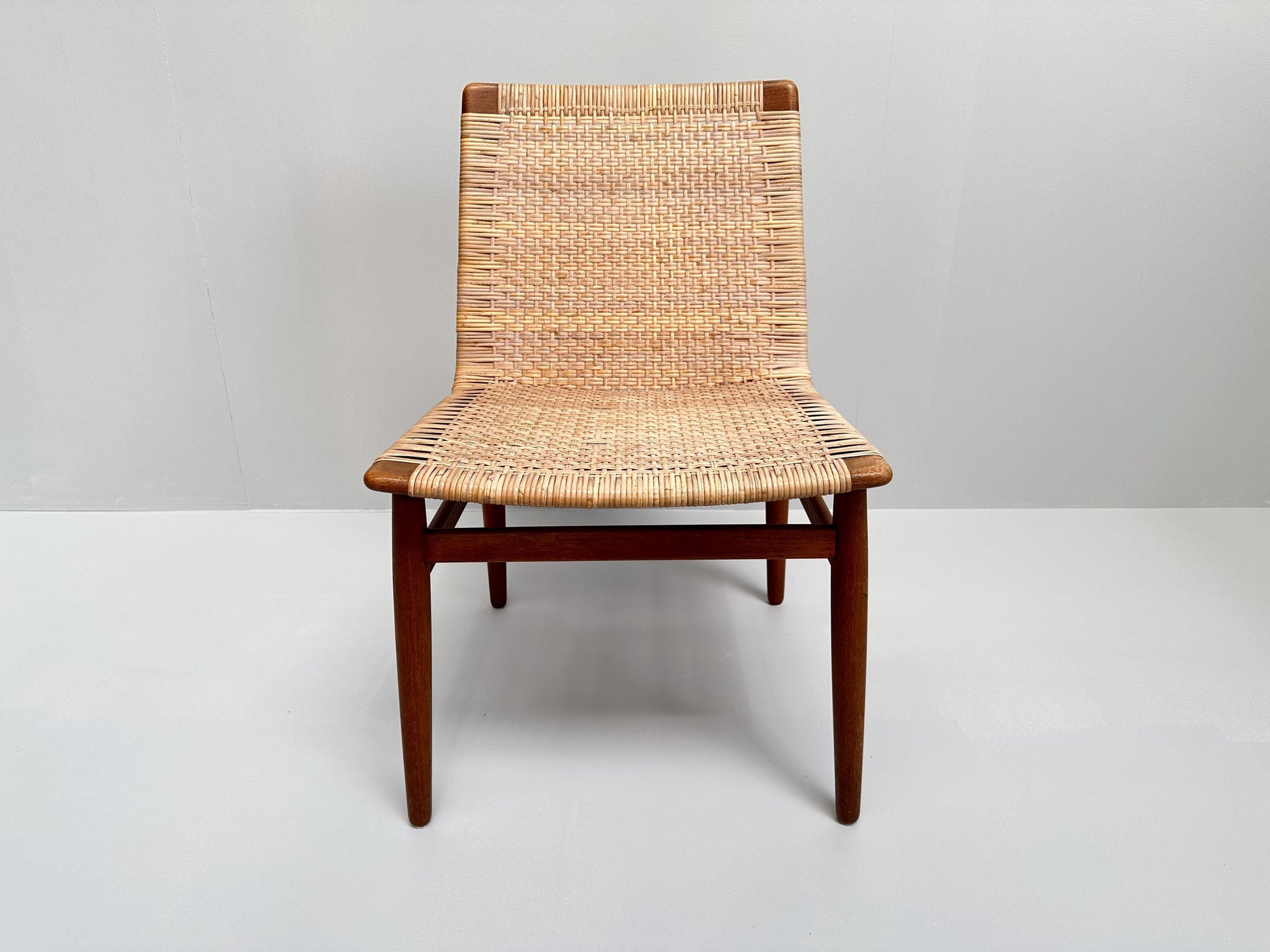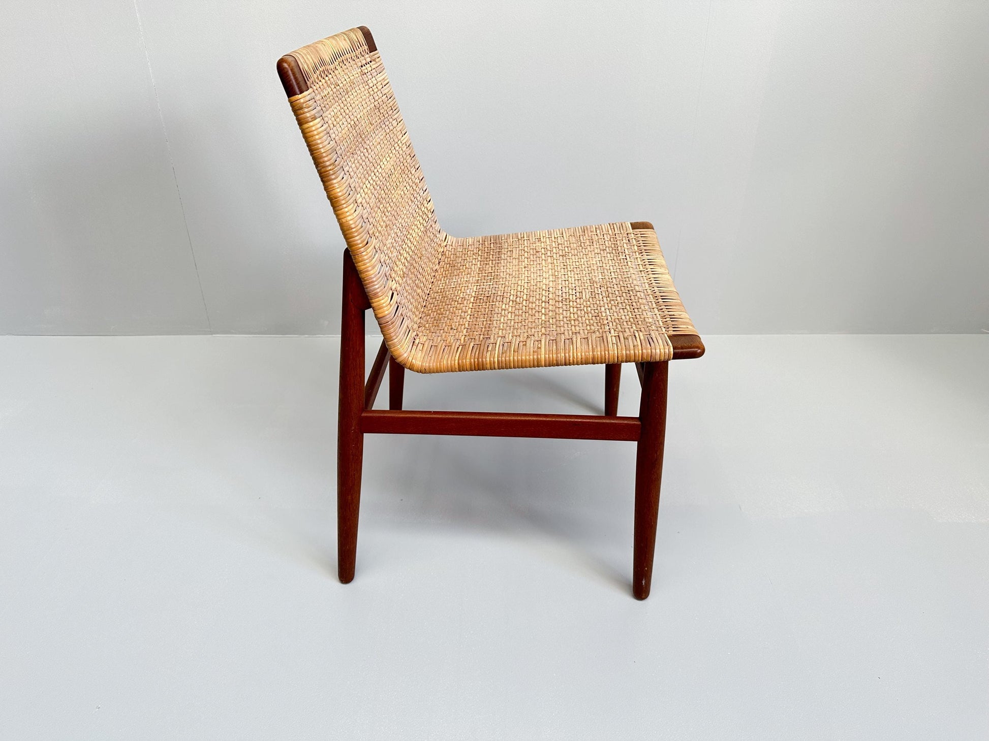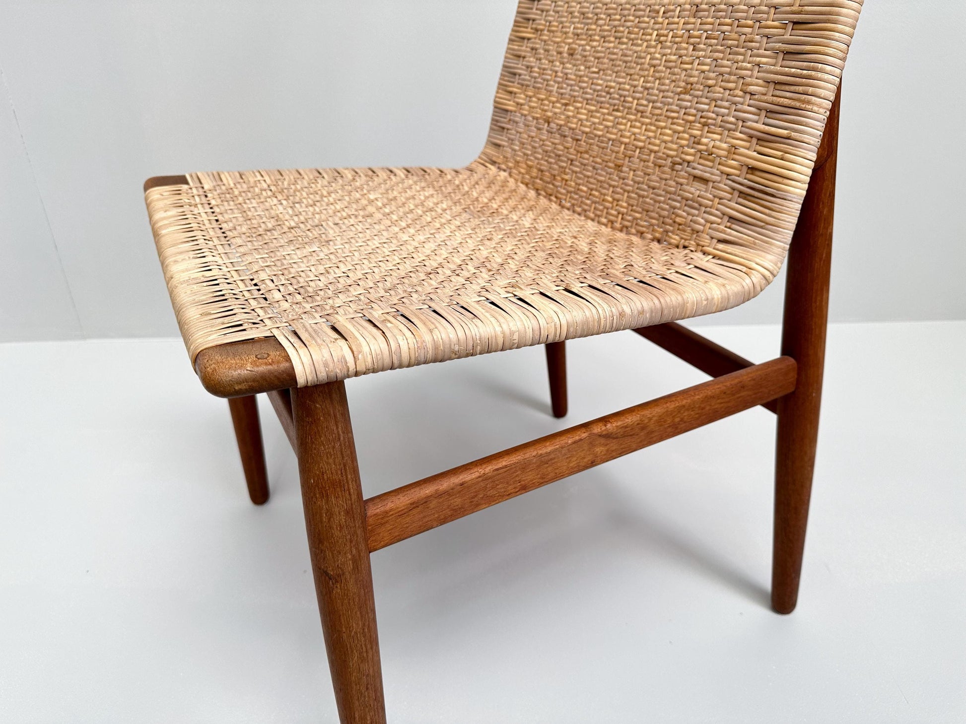 This very rare teak and rattan chair, designed by Jørgen Høj and produced by Thorald Madsen in Copenhagen during the 1950s, is a fine example of Danish modern design. Crafted from warm solid teak combined with light woven rattan, it embodies the essence of Scandinavian craftsmanship with its clean lines, functional simplicity, and natural materials.
