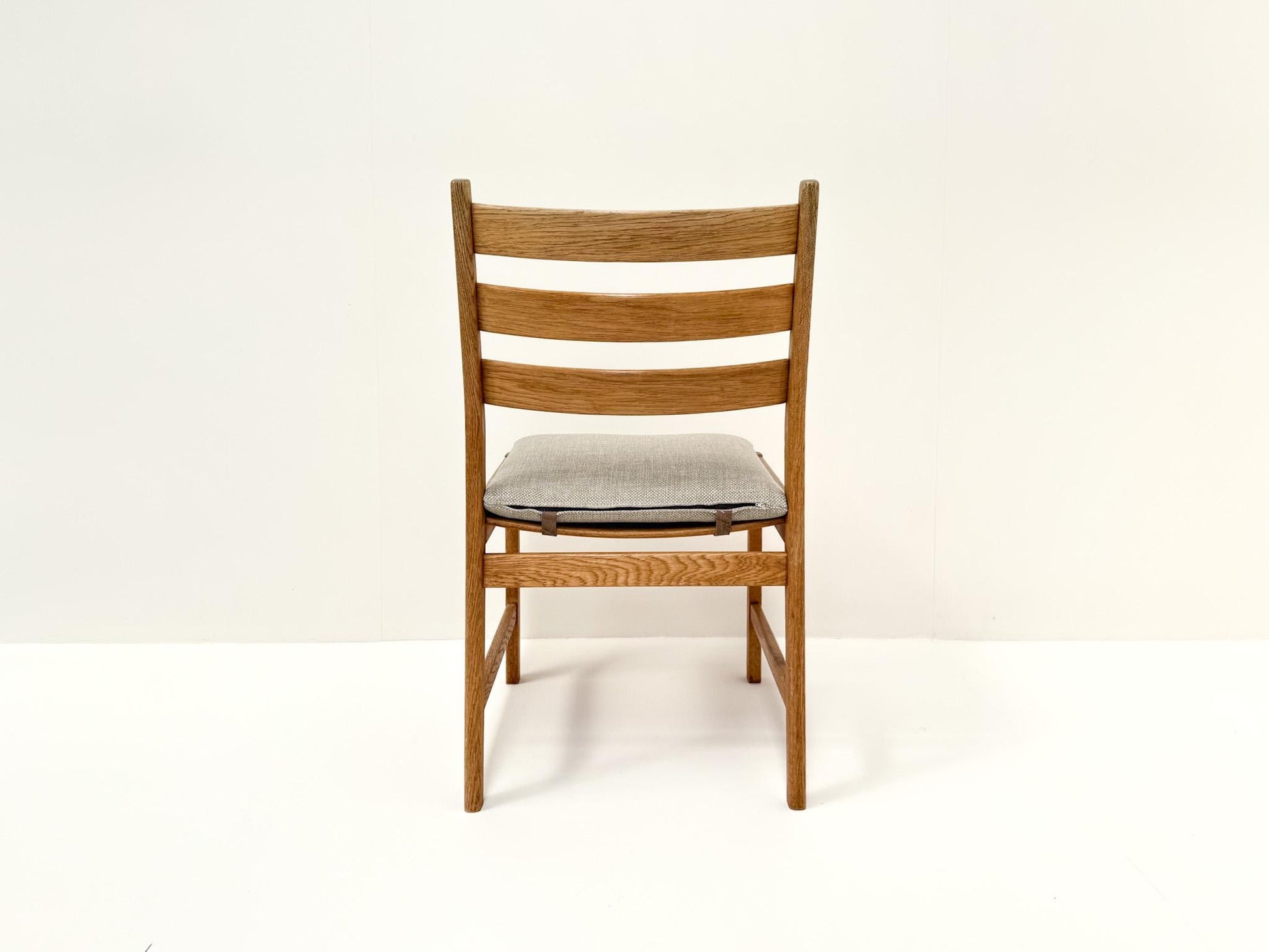 This beautiful set of four dining chairs was designed by Kurt Østervig and made in Denmark. The frames are crafted from solid oak, highlighting elegant Scandinavian lines and high-quality craftsmanship. The seats are newly upholstered in light grey fabric and secured with leather straps at the back, adding both function and a refined detail to the design. With their timeless silhouette and comfortable proportions, these chairs are an excellent example of mid-century modern furniture — ready to use and perfectly suited for both contemporary and vintage-inspired interiors.