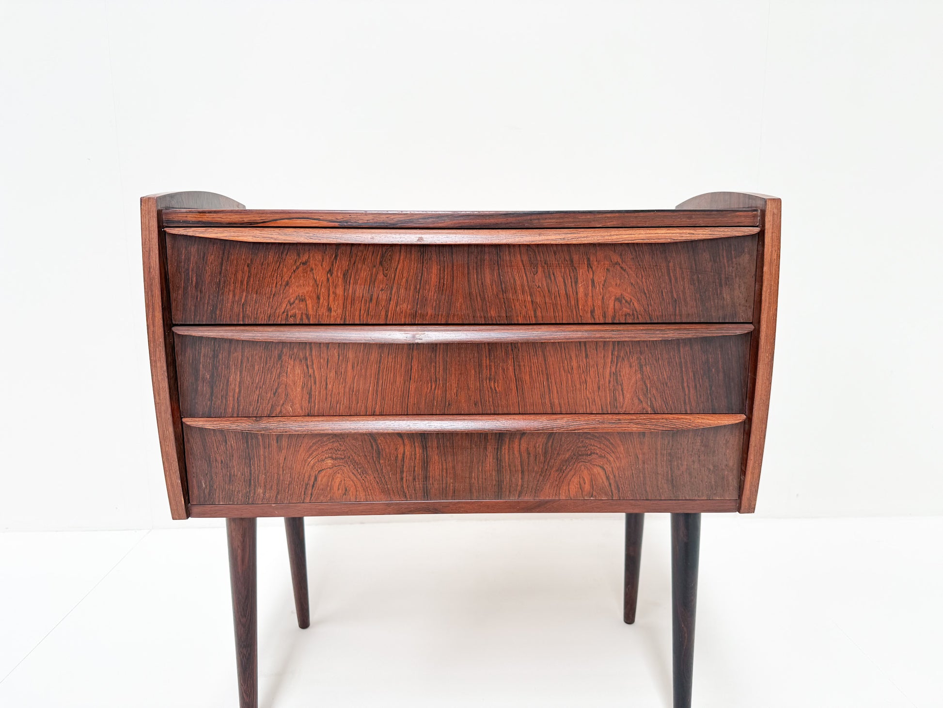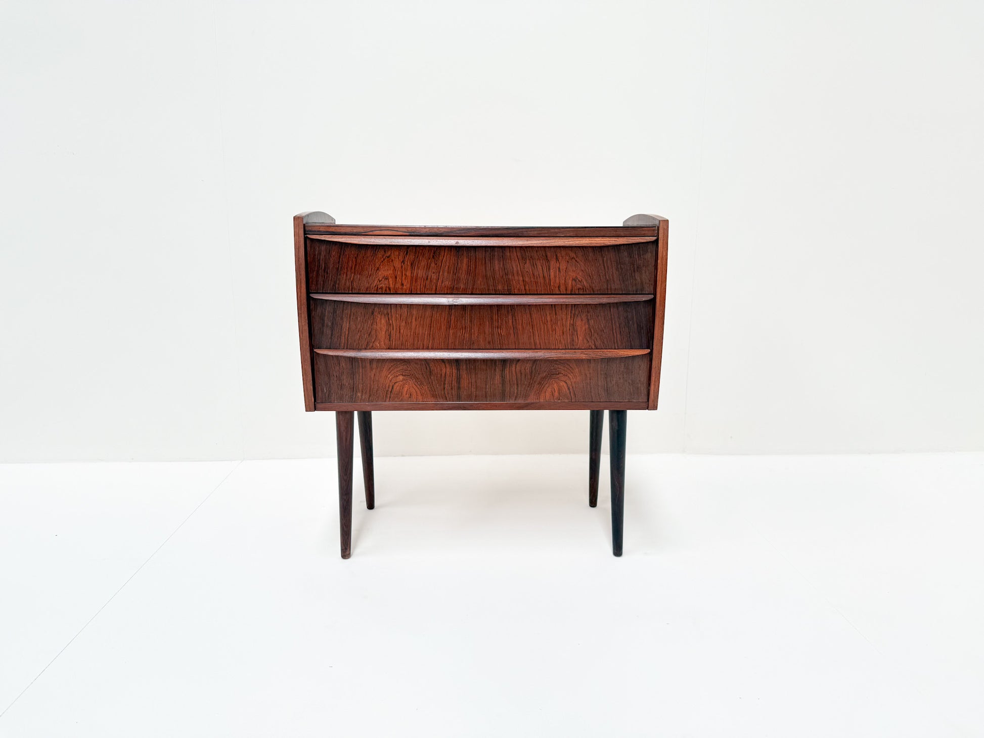 Elegant mid-century modern chest of drawers in rosewood, crafted in Denmark during the 1960s. This compact piece features three drawers with beautifully integrated handles and showcases the striking natural grain of the rosewood veneer. Raised on slender tapered legs, it combines functionality with timeless Scandinavian design.