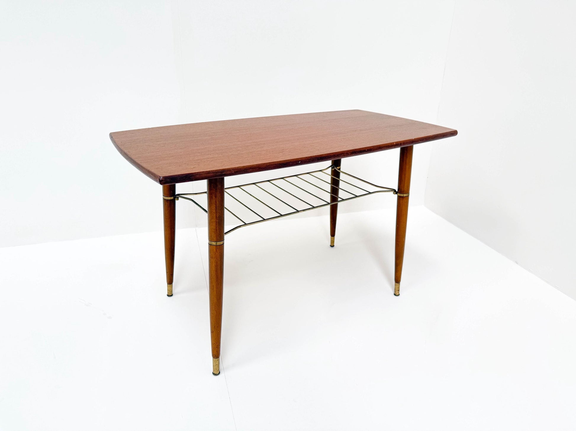 This elegant mid-century modern coffee table features a refined teak wood top with softly curved edges, embodying a timeless Scandinavian aesthetic. The table stands on four slender, tapered wooden legs with brass-capped feet. A sleek, gold-toned metal rack beneath the tabletop provides functional storage space, perfect for magazines or decorative items. The harmonious blend of warm wood tones and brass accents makes this piece a versatile addition to both minimalist and vintage-inspired interiors.