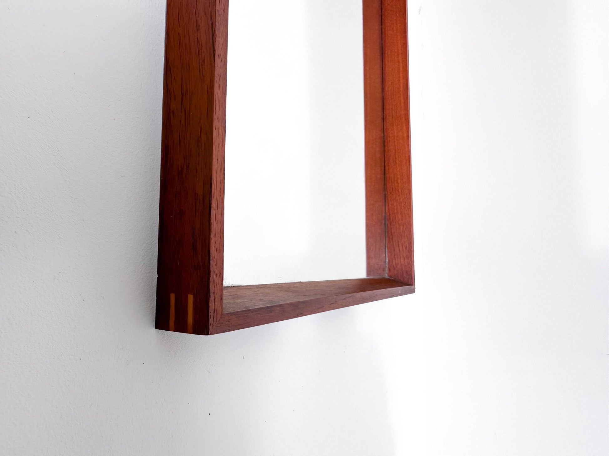 This elegant Danish Modern wall mirror was made by Jansen Spejle in the mid-20th century. It features a minimal teak wood frame with beautiful joinery details and a warm teak tone, typical of midcentury Scandinavian craftsmanship. Its slim, vertical design makes it ideal for hallways, bedrooms, or bathrooms. A timeless and functional piece with refined details.
