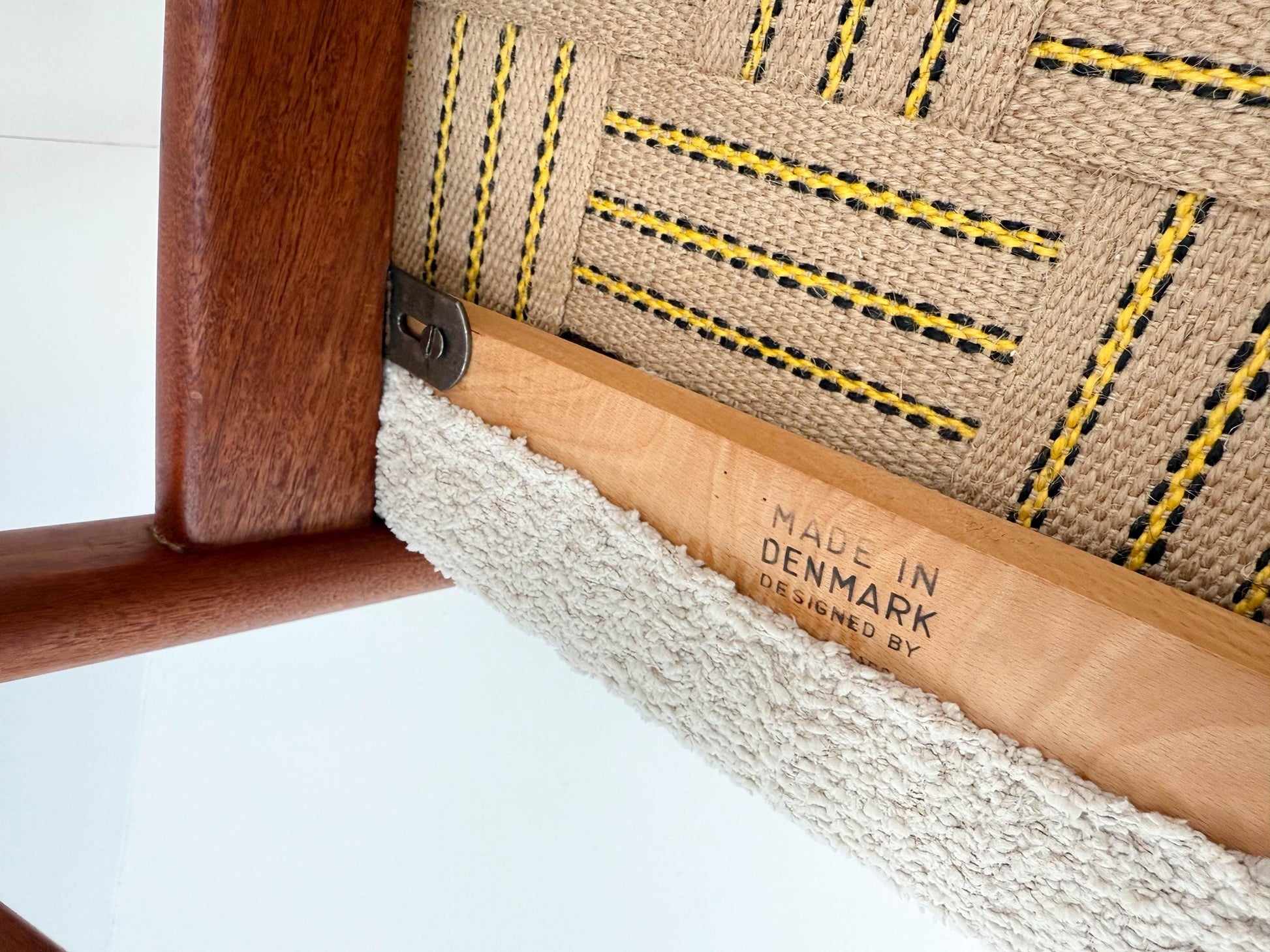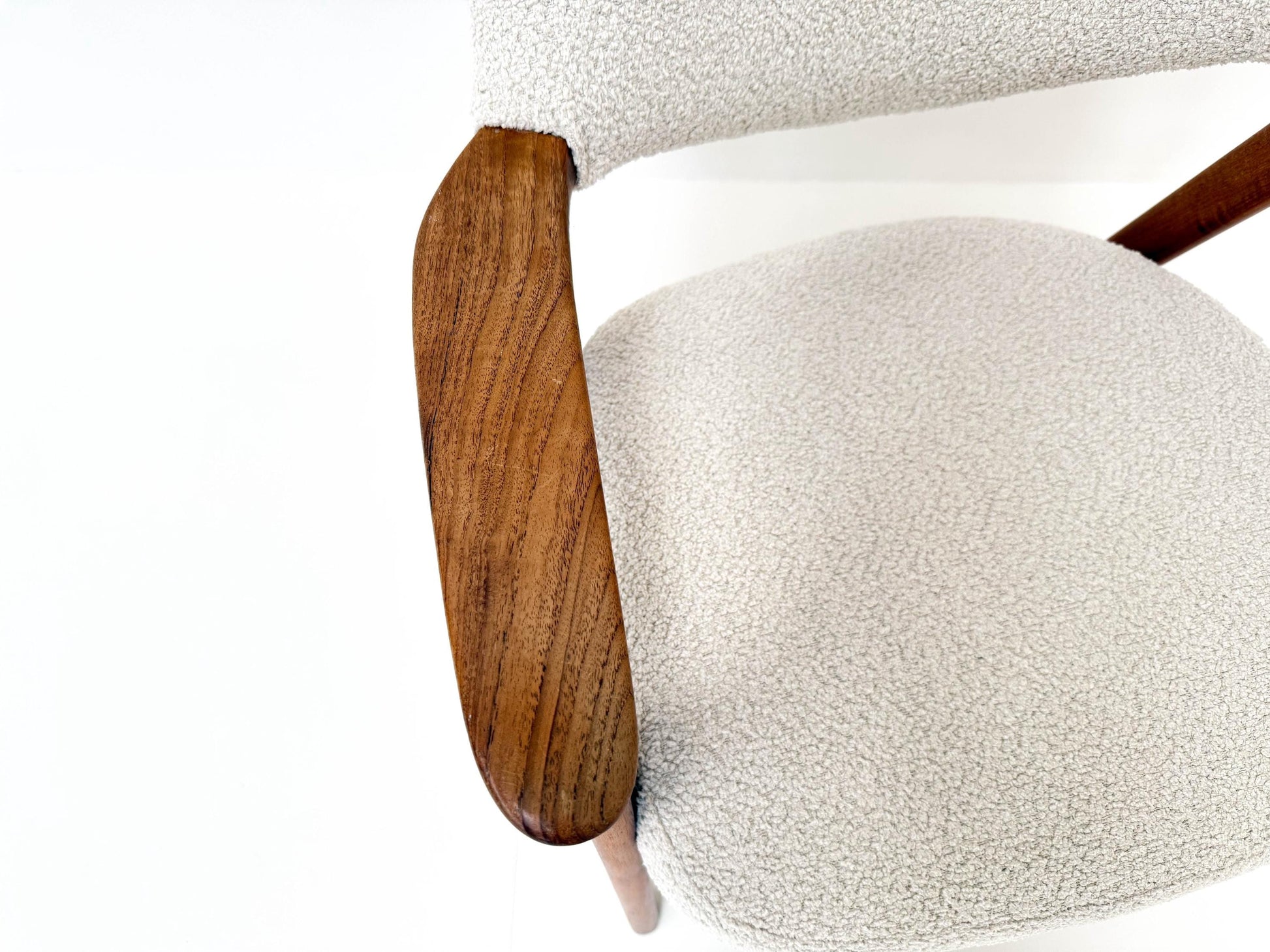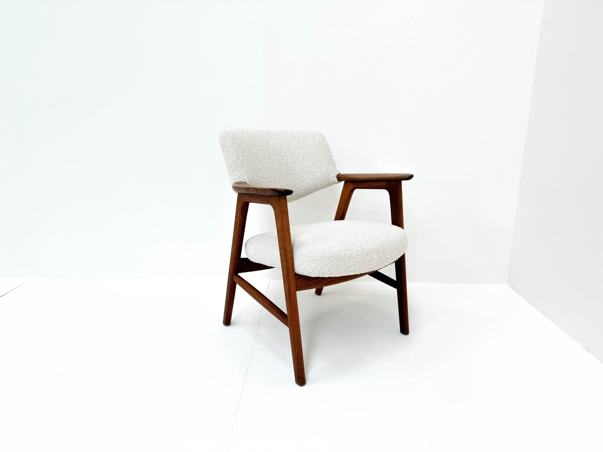 This beautifully crafted Danish armchair, designed by Erik Kirkegaard in the 1960s, model 42 is a quintessential piece of mid-century Scandinavian design. The sculptural frame in solid teak features elegantly curved armrests and refined joinery, showcasing the timeless quality of Danish craftsmanship. Our professional upholsterer has completely reupholstered the chair using high-quality bouclé fabric and premium foam, ensuring both comfort and durability while preserving its authentic charm. A perfect blend of vintage character and modern comfort, ideal for stylish interiors with a love for design heritage.