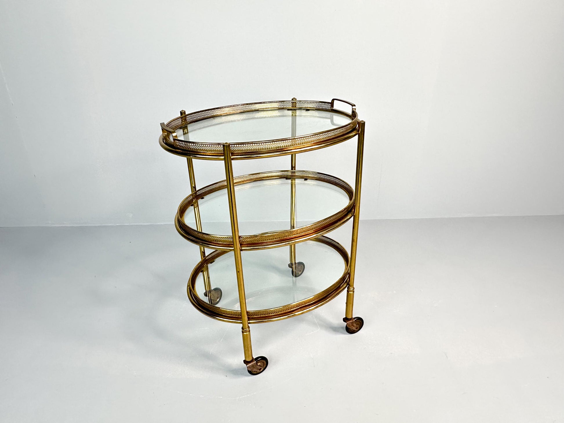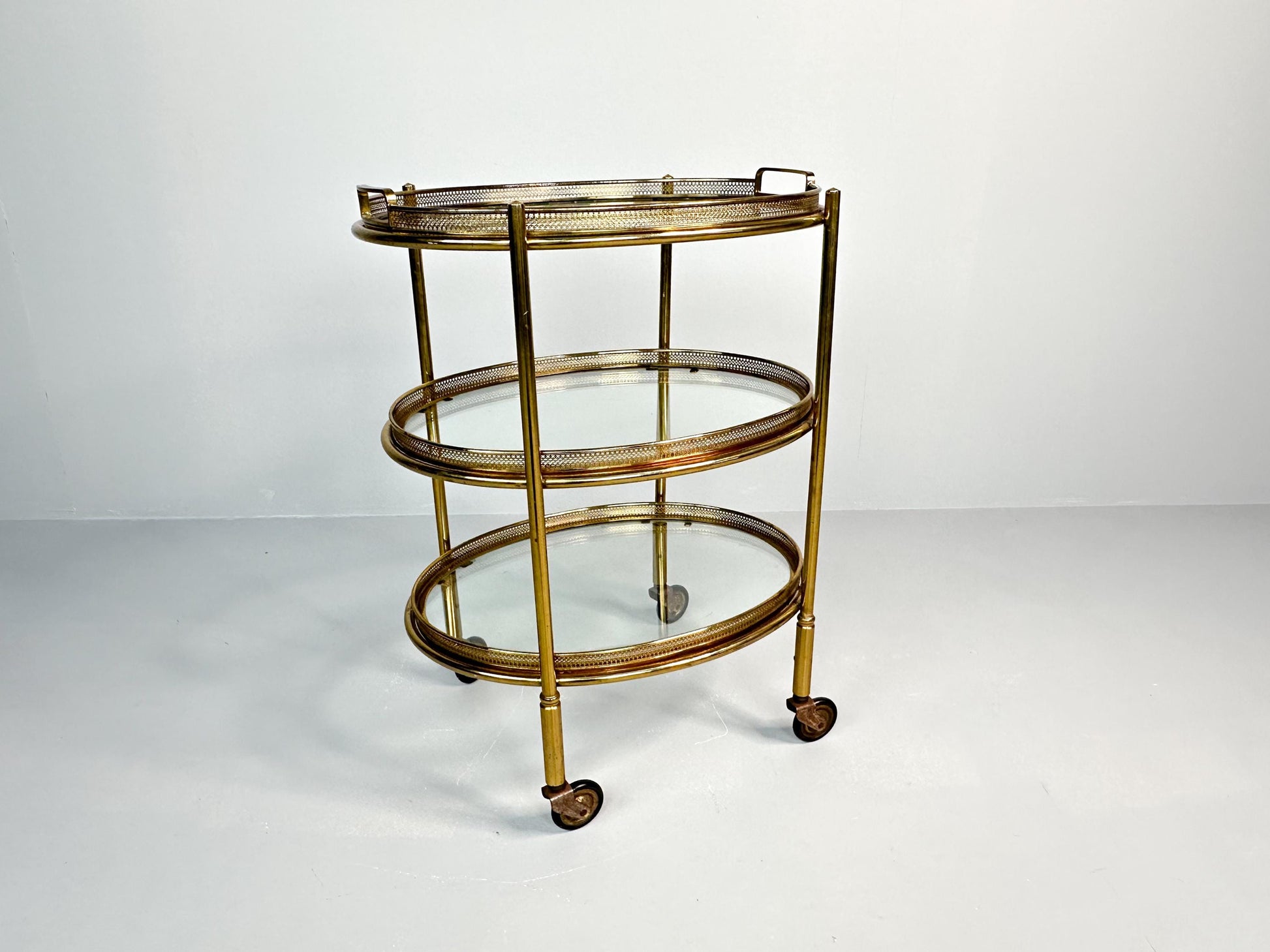 Stylish oval serving trolley in brass and glass with three removable trays. The étagère has a compact design, so be sure to verify the measurements to ensure it fits your space.