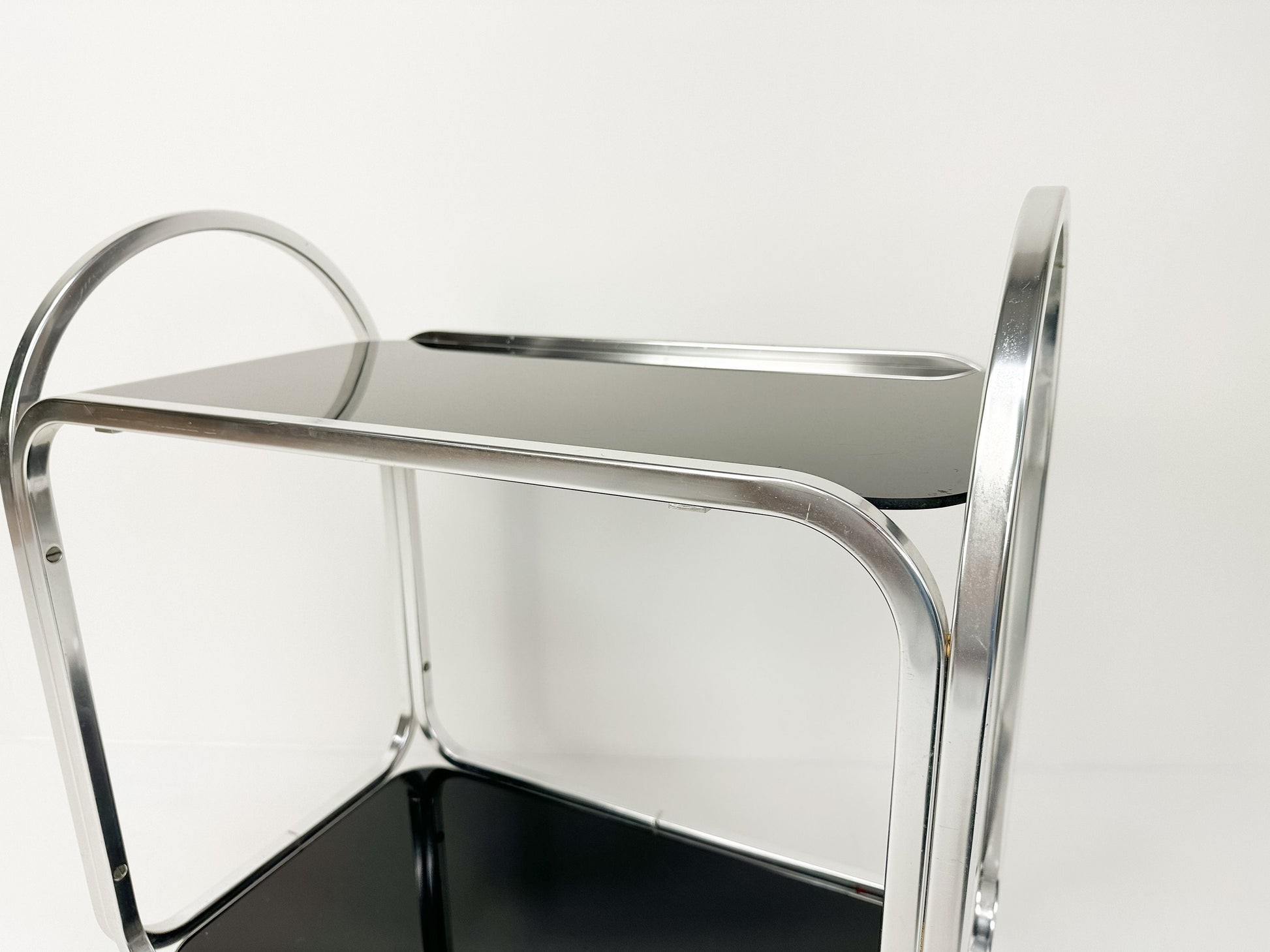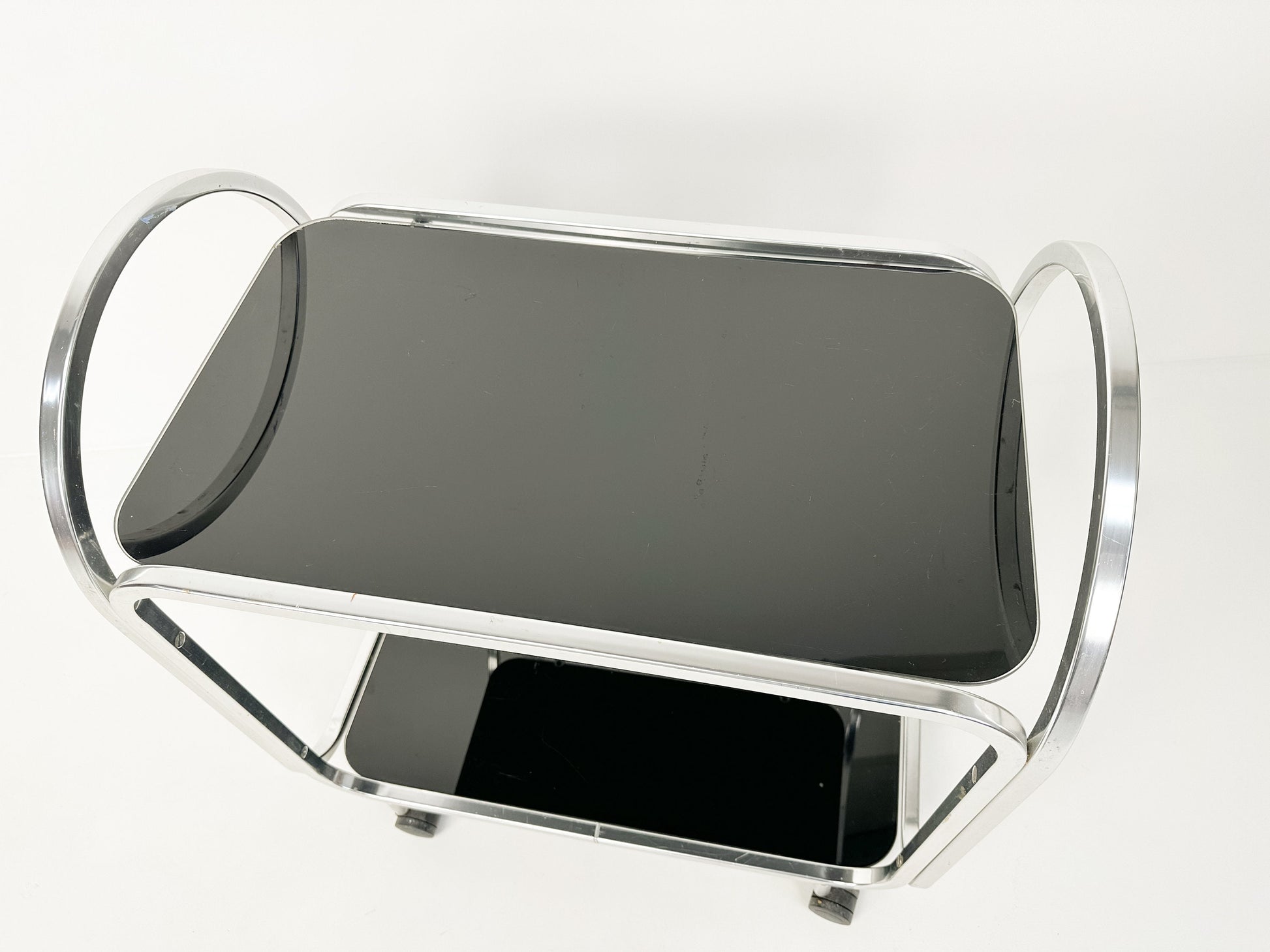 Lovely mid-century serving trolley with black glass shelves. The trolley is in overall good vintage condition with some signs of wear and age, some scratches and imperfections on the base and on the glass. Please see the pictures (zoom them) to make your own judgement. The pictures are a part of the description.