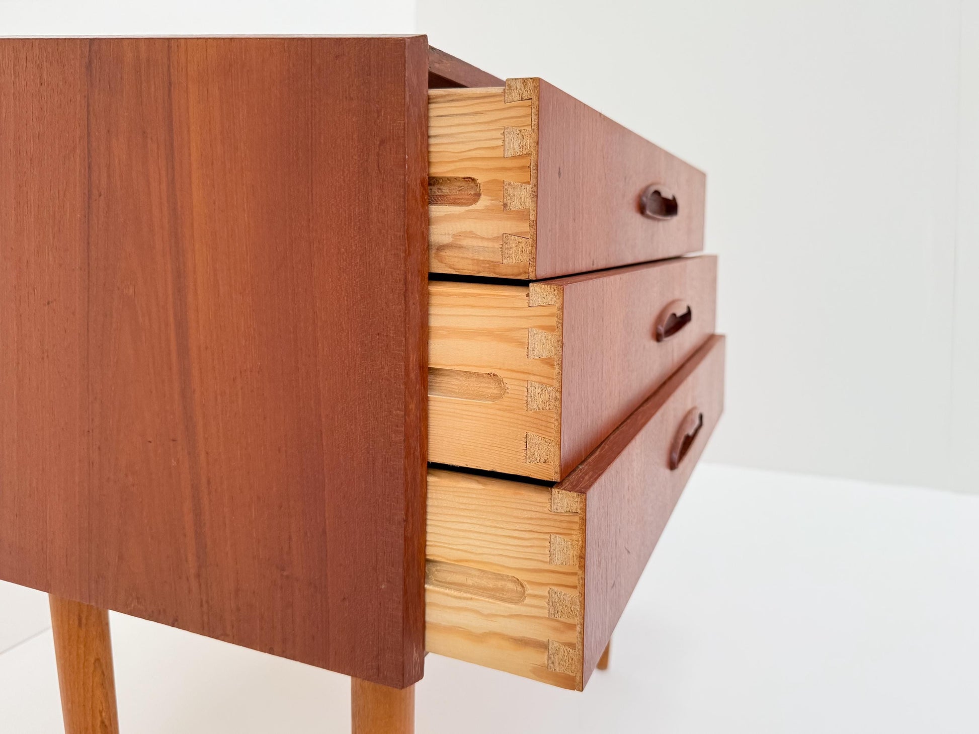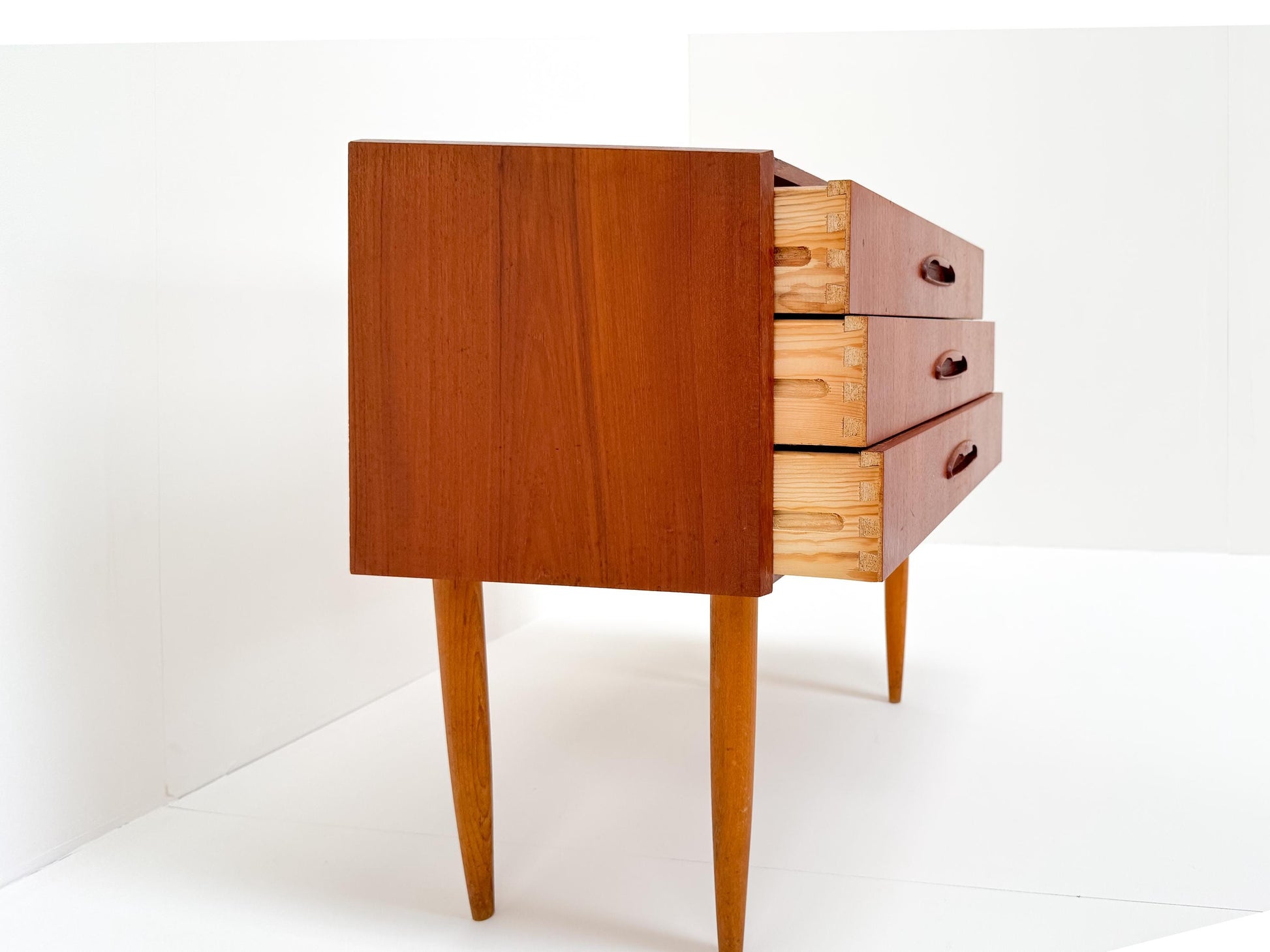 This compact Danish chest of drawers features a warm teak wood finish. The chest is elevated on four tapered legs, characteristic of Scandinavian minimalist design. It has three drawers, each adorned with carved recessed handles, seamlessly blending functionality with aesthetic appeal.