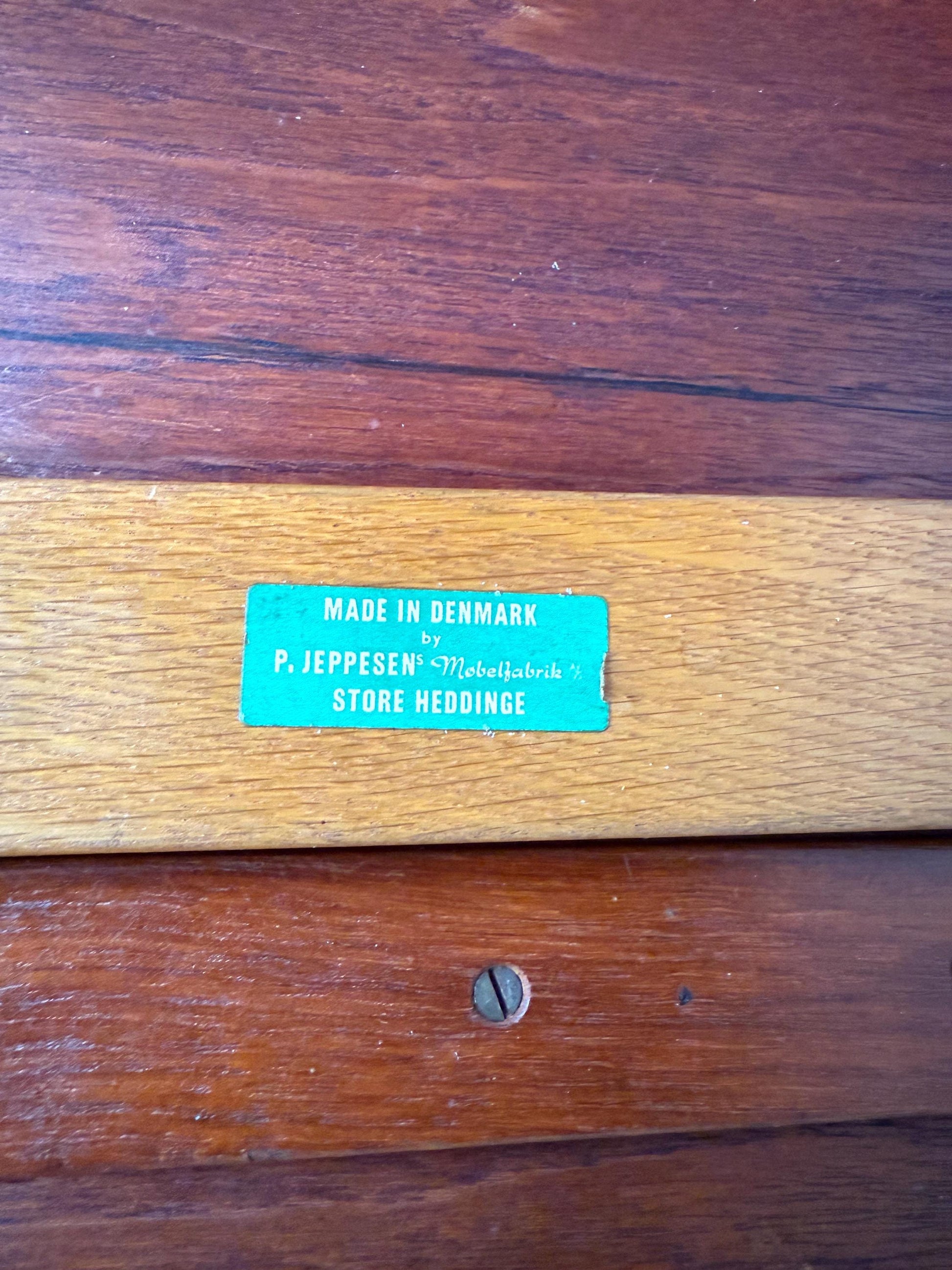 This exquisite serving trolley, made by Jeppesen Møbelfabrik in the 1960s, is a perfect example of Scandinavian craftsmanship and functional elegance.Crafted from rich, warm teak, this piece showcases Wanscher’s dedication to refined aesthetics and practicality. The trolley features a compact rectangular structure with slightly tapered legs, all set on smooth-rolling caster wheels for effortless movement. A lower shelf provides additional storage, making it ideal for serving drinks, coffee, or displaying decorative pieces. One of the trolley’s standout features is its innovative expandable tabletop, which unfolds symmetrically via brass hinges, doubling the available surface area. This clever mechanism makes it a highly versatile piece—compact when needed and spacious when extended.