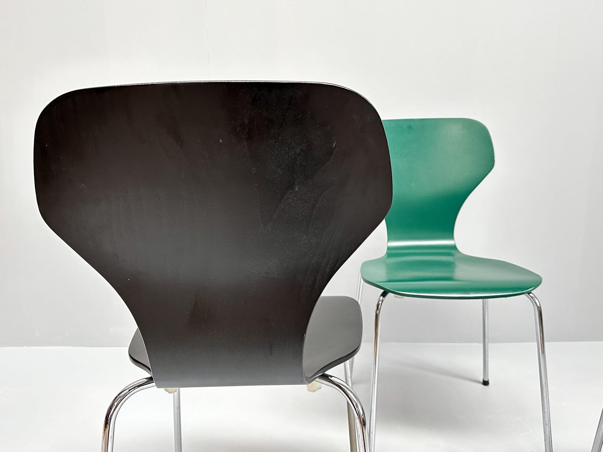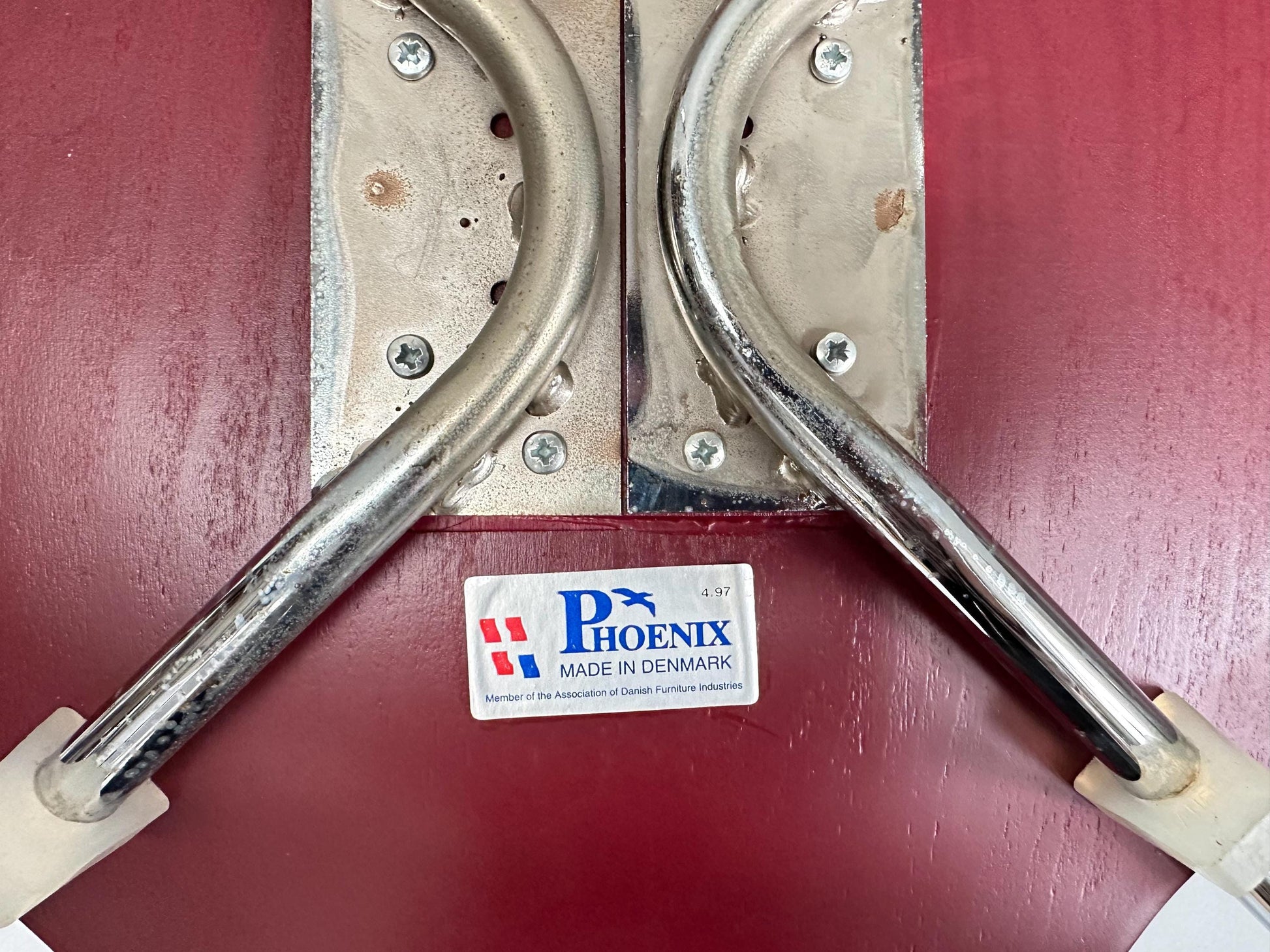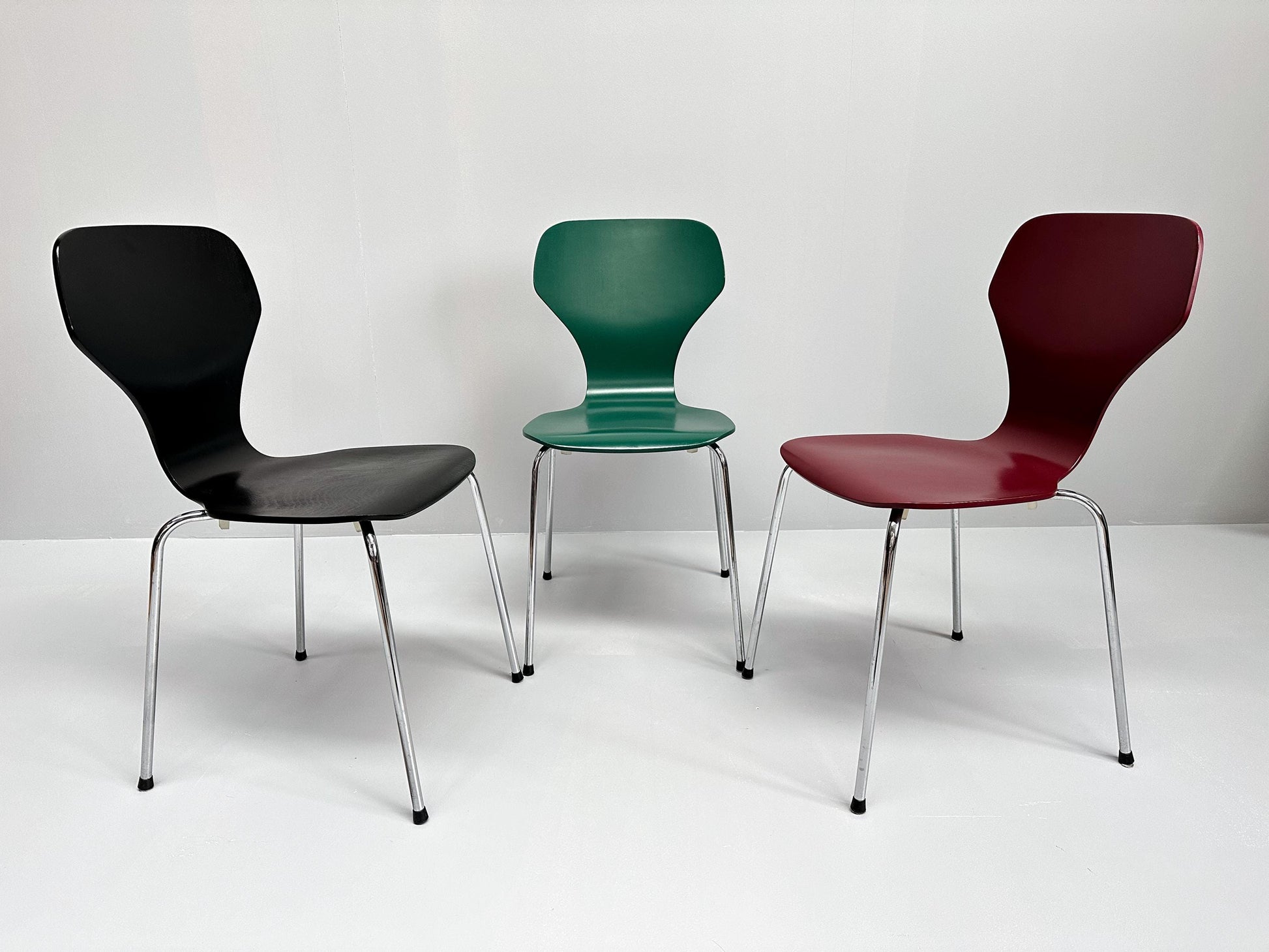 Vintage set of 3 Phoenix chairs from Denmark, crafted in the 1990s. Featuring sleek plywood seats in rich bordeaux, green and black, these chairs combine style and comfort. The chrome bases offer a sturdy and minimalist aesthetic, perfect for dining or office use. A unique and timeless addition to any modern or vintage-inspired decor.